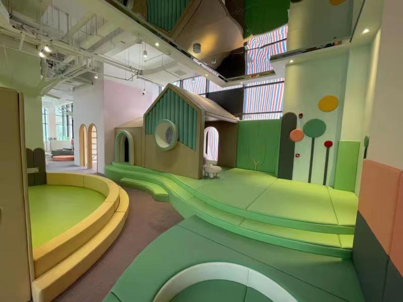 在阿貍的童話世界設(shè)計中,我們通過對紅、綠、黃等主要色塊的搭配與協(xié)調(diào),打造了極具吸引力的視覺效果,配充滿童夢風格的阿貍元素背景墻,營造整體空間的溫暖風格,以此讓兒童在安全放松、氣氛明快、活躍的游樂環(huán)境中享受玩耍所帶來的酣暢愉悅感。